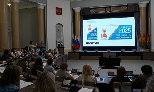 Перед началом мероприятия председатель облизбиркома Сергей Елманов представил логотип единого дня голосования, разработанный ЦИК России и напоминающий о главном событии этого года - 80-летии Победы в Великой Отечественной войне.