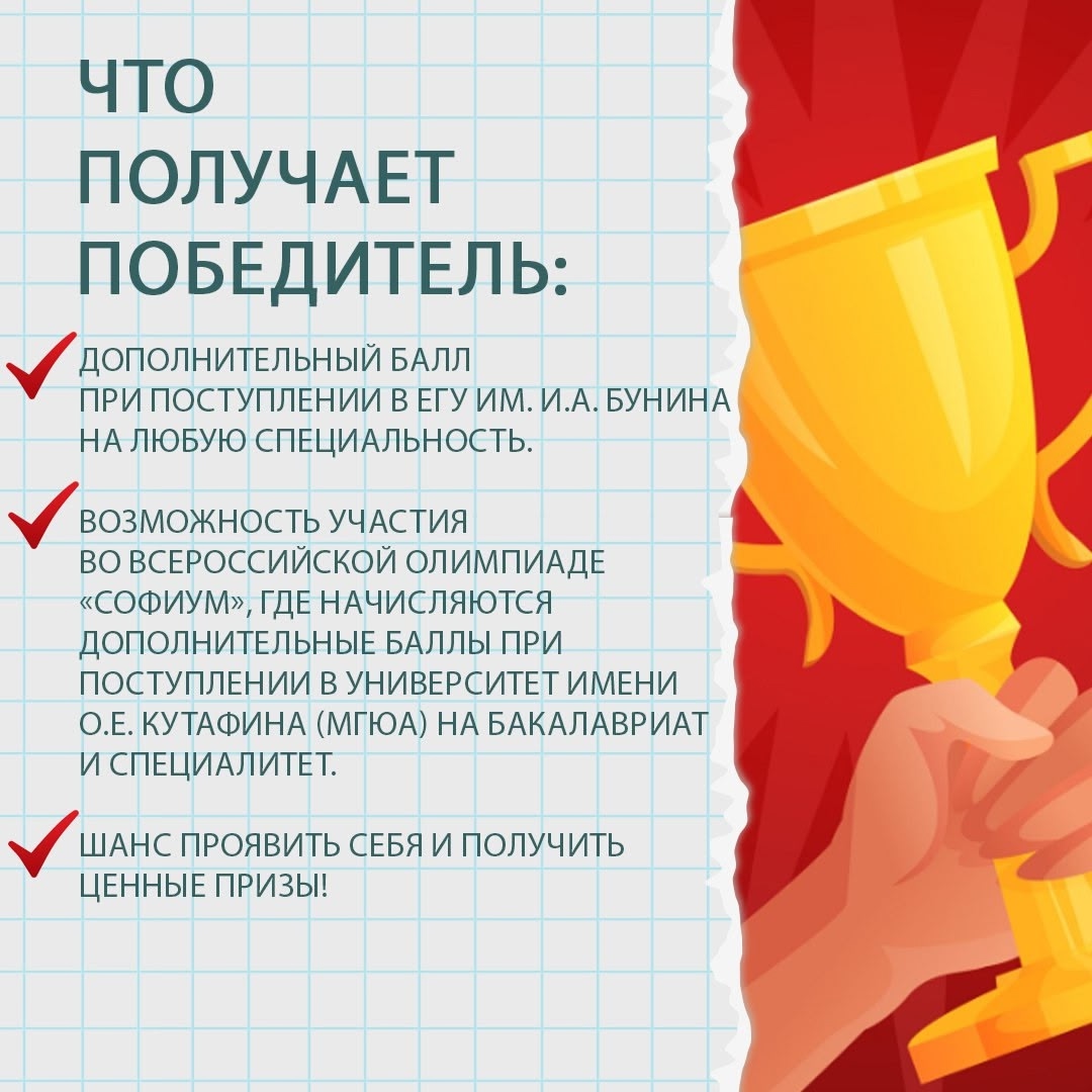Победив, ты сможешь получить дополнительный балл при поступлении в ЕГУ им. И.А. Бунина на любую специальность. А еще твоя победа – это возможность попробовать свои силы во Всероссийской олимпиаде «Софиум». За наилучшие индивидуальные достижения в этом состязании начисляются дополнительные баллы при поступлении в Университет имени О.Е. Кутафина (МГЮА) на обучение по образовательным программам высшего образования (бакалавриат и специалитет).